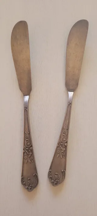 Elegante juego de cubiertos antiguos. Perfectos para añadir un toque clásico a tu mesa. - Incluye 5cucharas, 1 tenedor,1 cucharón y 4 cuchillos. - Además, se incluye una bandejita de alpaca y plata. - Piezas en buen estado, con señales normales de uso.