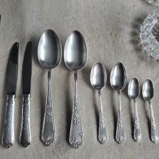 Conjunto de cubiertos antiguos con un diseño clásico y elegante. - Piezas de metal con acabado plateado. - Ideal para coleccionistas o para añadir un toque vintage a la mesa. Marca Meneses ,36 piezas