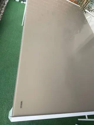 Conjunto de mesa de crital y seis sillas de aluminio y textileno, para exterior o balcón. Las sillas se pliegan. Esta completamente nuevo, comprado de hace 4 meses, la mayoria del tiempo ha estado cubierto, no le a dado sol ni lluvia. Medidas: -Anchura: 90 cm -Altura: 70 cm -Profundidad: 160 cm