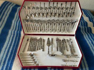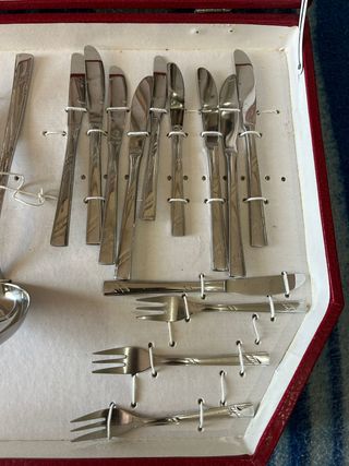 Elegante juego de cubiertos de metal en un maletín rojo. Se incluye un juego completo para 12 personas, con 70 piezas en total. Los cubiertos presentan un diseño clásico y atemporal. - Ideal para ocasiones especiales o uso diario. - Piezas en perfecto estado. - Maletín en buen estado. ((Faltan dos cuchillos de un modelo tres de otro y dos tenedores pequeños))