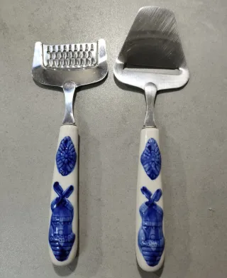 Set de dos utensilios para queso con mangos decorados. Comprado en Holanda. Solo se ha usado una vez. Puede que tenga alguna señal de estar guardado en un cajón con los cubiertos. - Un cortador de queso. - Un rallador de queso - Mangos de cerámica con diseño azul y blanco.