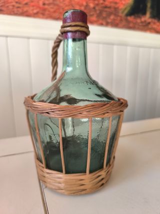 Garrafa de vidrio con un revestimiento de mimbre tejido. El vidrio es de un tono verdoso y la boca esta cubierta con cera o lacre rojizo. El revestimiento de mimbre, hecho con varas finas entrelazadas, con un asa unida al cuello, lo que permite sujetarla con mayor facilidad. Falta una se las varillas transversales, se aprecia en la ultima foto.