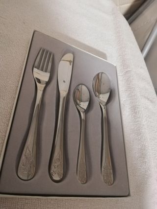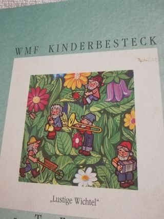 Cubiertos niño-niña acero inoxidable, grabados figuras nomos, de la marca WMF sin estrenar y en su estuche orijinal