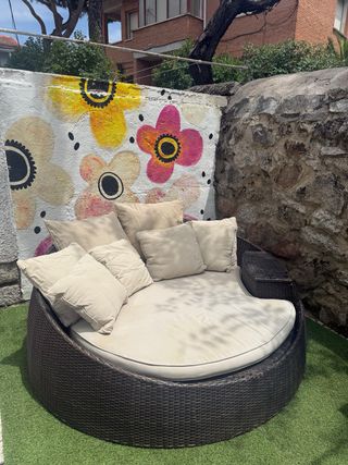 Sofá cama redondo exterior. Incluye cojines y funda protectora. 170diámetro x 70alto Tiene los típicos detalles de uso, y de estar al exterior pero está en buen edtado. Igual pasa con la tela de los cojines. El resposabrazos está suelto, atado con bridas. Pero está perfecto para seguir utilizándolo. Los cojines han estado siempre en interior en invierno, y cubiertos funda en verano. Me da pena venderlo, pero no le doy ningún uso, es ideal si tienes una zona cubierta para evitar tener que poner la funda Envío a través de Method (ver foto final) Se necesita furgoneta grande. SIN MARCA, Wallapop hace poner una