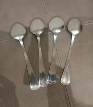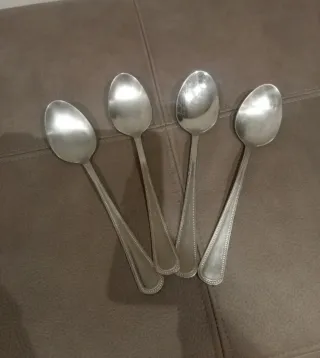 Conjunto de cubiertos de metal, ideales para hostelería. - 24 cuchillos, 24 tenedores y 12 cucharas, ideales para acompañar a los pintxos de tu bar. - Son cubiertos de postre. - Diseño elegante y funcional. - Acabado plateado brillante. - Usados durante un año y medio.