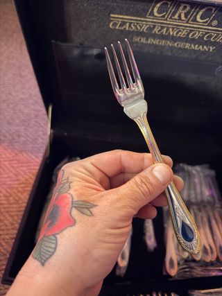 Elegante juego de cubiertos de la marca CRC, fabricados en Alemania. - Diseño clásico con detalles dorados. - Mango con un distintivo detalle azul. /////PRECIO NEGOCIABLE/////