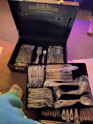 Elegante cubertería antigua con un diseño clásico. - Juego completo de cubiertos. - Acabado plateado brillante. - Incluye cuchillos, tenedores y cucharas.