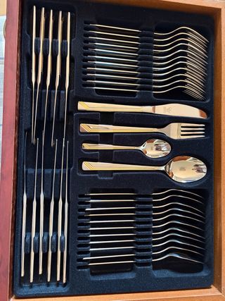 Elegante juego de cubiertos con detalles dorados. - Diseño clásico y refinado. - Acabado brillante. - Incluye cuchillos, tenedores y cuchara.