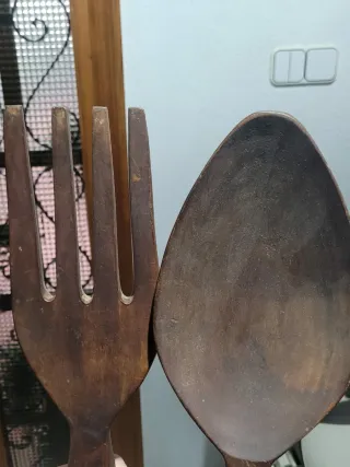 Set de cubiertos decorativos de madera, con un diseño que evoca la década de los 70. Son piezas únicas para añadir un toque rústico y vintage a tu hogar. - Fabricados en madera. - Color marrón oscuro.