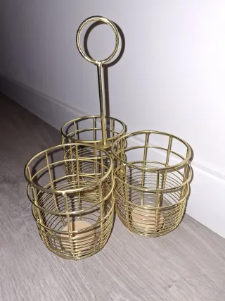 Elegante organizador de cubiertos con un diseño moderno. - Fabricado en metal dorado. - Base de madera. - Tres compartimentos para organizar tus utensilios.