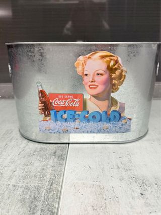 Cubitera metálica de Cocacola con asas Buen estado aunque en el interior tiene marcado el culo de las latas que venían con la cubitera No ha sido usada Medidas aproximadas 30x18x20cm
