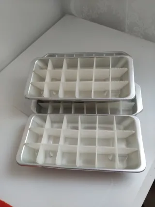 Conjunto de cuatro cubiteras vintage de aluminio con separadores de plástico blanco. - Diseño clásico. - Cada cubitera tiene 24 compartimentos individuales.