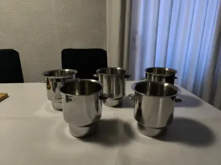 Conjunto de cinco cubiteras de acero inoxidable. Marca suprem inox - Diseño moderno y funcional. - Asas laterales para facilitar el transporte. - Base estable para mayor seguridad. - Diámetro máximo 12,5cm altura 13cm