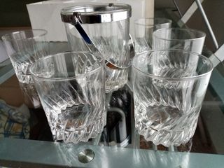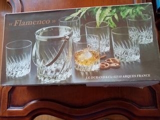 Juego de vasos de whisky. De la marca Luminarc, modelo Flamenco . Este juego consta de 7 piezas , 6 vasos y una cubitera. Fabricado en cristal de excelente calidad, muy resistente y de gran transparencia. Tienen unas originales ondulaciones en las bases y el cristal está tallado. La cubitera con asa y aro de separación de acero inoxidable. Medidas : Cubitera : Altura = 13cm. Diámetro = 11cm. Vasos : Altura = 9 cm. Diámetro = 8 cm. Tengo más cosas en mi perfil.