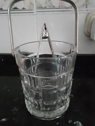 Cubitera de cristal con asa plateada y pinza de acero inoxidable. Medidas : Altura =13cm., diámetro =11cm. Nuevo. Sin usar. Tengo más cosas en mi perfil.