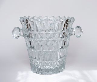 Cubitera vintage de cristal de excelente calidad, para servir hielo, para bar, coctelería o mesa. Fabricada por la prestigiosa casa Val Saint Lambert. Firma original en la parte inferior. Original años 50. Vidrio pesado tallado, con paredes gruesas para mantener el frío. Diseño muy característico, con dos pequeñas asas laterales macizas integradas. Muy buen estado con pequeñas señales de uso y antigüedad. • Altura: 12 cm • Diámetro: 12 cm • Diámetro con asas:14 cm • Forma cilíndrica levemente acampanada hacia la parte superior. • Decoración: estriado vertical clásico, que refracta la luz y le da un aspecto elegante.