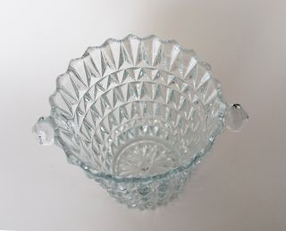 Elegante cubitera de cristal con un intrincado diseño tallado. Sus asas facilitan su transporte. medidas: Diametro boca 11,5cm / Altura 13cm - Diseño tallado con motivos geométricos. - Asas laterales para un agarre cómodo.