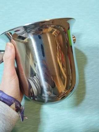 Preciosa cubitera champanera italiana de calidad , acero inoxidable 18/10 (tambien se puede usar para vino o otras botellas) ,precio 12 euros (costo 60 euros nueva) ,perfecto estado ,el color blanqucino que se ve en la foto es de la camara que no fotografia bien el cromado ,esta limpia vaya y es de inoxidable que se limpia con sidol en un minuto y reluce ,al natural se ve perfecta pero en la foto sale el halo blanquecino ,entrego en logroño o envio a toda españa por 10 euros de gastos de envio Mirar en mi perfil mis otros anuncios,vendo todo el contenido de mi chalet , todo tipo de cosas de arte y decoracion de estilo clasico