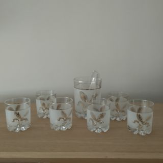 El conjunto se encuentra en buen estado - Incluye varios vasos con un diseño de barco grabados - También se incluye una cubitera. - Además, se ofrece una botella. - El color es transparente.