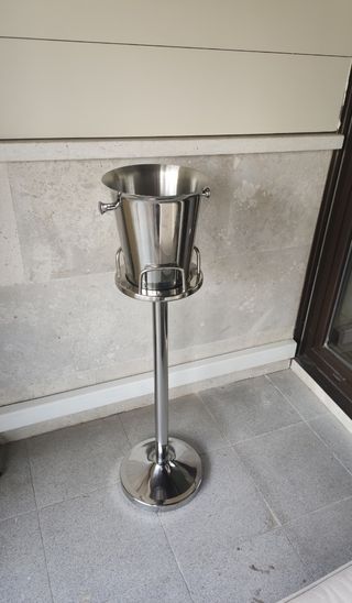 Elegante champanera con su soporte. - Fabricada en acero inoxidable. - Diseño moderno y funcional. -Diametro cubitera: 20cm altura soporte, incluida cubierta posada: 74cm