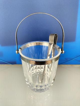 Cubitera de cristal tallado de alta calidad con asa metálica y pinzas a juego. En muy buen estado.