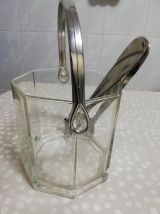 Cubitera de cristal con forma octogonal. Asa de metal. Pinza de inox.-18/8.
