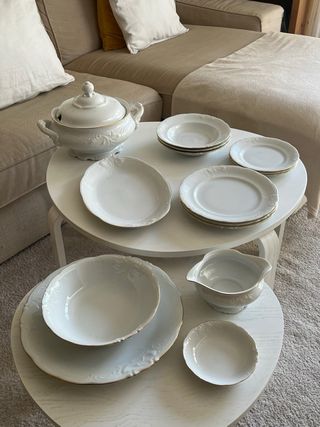 Vintage. Vajilla de loza blanca con ribete en dorado, marca Alhambra. Compuesta por 42 piezas: - 12 platos llanos. - 12 platos hondos. - 12 platos de postre. - 1 sopera. - 2 salseras. - 1 fuente honda. - 1 fuente llana. - 1 fuente alargada. Sin estrenar y guardada en sus cajas orginales tal y como se ve en las fotografías.