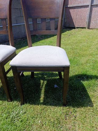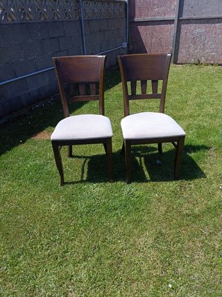 Pareja de sillas de comedor de madera maciza con un bonito tapizado en color beige. Se encuentran en buen estado., aunque necesitan una buena limpieza con un limpiador apropiado o si se prefiere lijar y pintar en cualquier otro color. - Estructura robusta de madera. - Ideales para comedor o cocina. Se venden las dos juntas y no se baja el precio. El precio es por las dos de 35. No hago envíos ya que al ser madera maciza pesan.