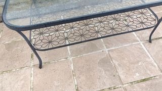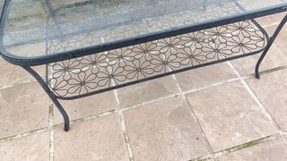 Preciosa mesa de centro de forja y cristal de Ikea. Es una mesa estable el cristal es súper gordo., en una de las fotos se aprecia como el cristal se puede desplazar para poder limpiar sin problema. La forja Necesita un buen limpiado o cepillado,ya que lleva un par de años a la intemperie., o incluso si se quiere pintarla. Se compró haciendo juego con otra pequeñita redonda que actualmente sigue en el portfolio de Ikea. - Tiene una balda inferior con un diseño floral. Recoger zona de Cudillero nos envía debido al volumen y el peso.