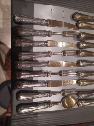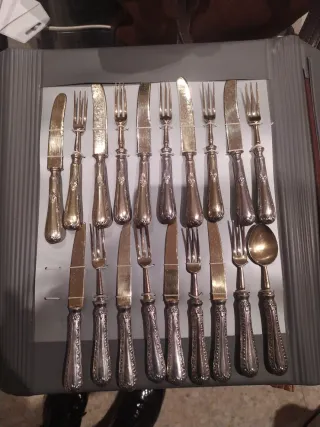 Conjunto de cubertería antigua con un diseño elegante y detallado. - Fabricada en alpaca y plata. - Incluye tenedores, cuchillos y cucharas. - Piezas con ornamentación clásica.