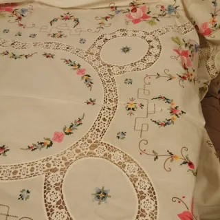 Elegante mantelería de lino, ideal para ocasiones especiales. Incluye 12 servilletas a juego. - Diseño bordado a mano con motivos florales. - Acabado con encaje. - Sin estrenar.Expectacular!! 12 servilletas