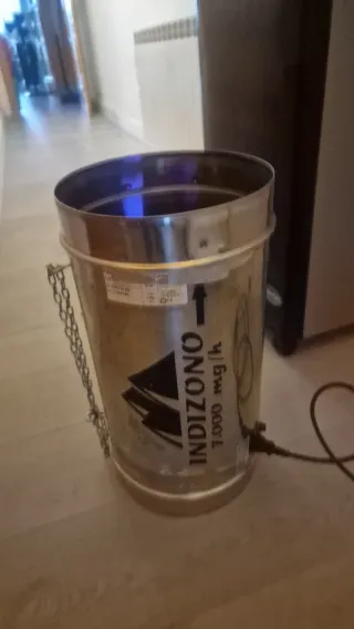 Ozonizador Indizono modelo 7000 con tecnología cerámica. - Diseño cilíndrico. - Acabado plateado y detalles en negro. - Incluye cadena para colgar. - Conexión eléctrica visible.