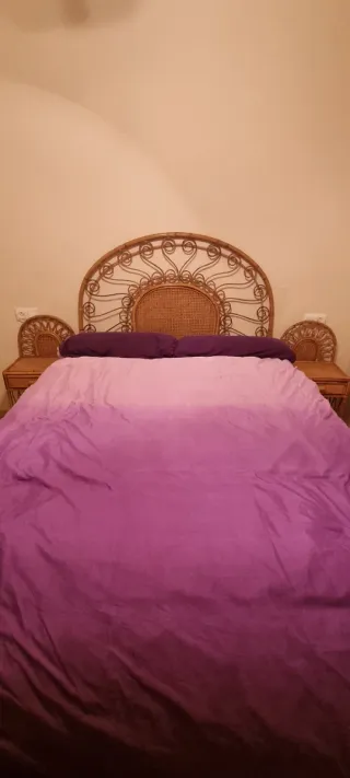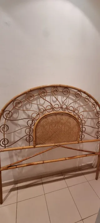Conjunto de cabecero y dos mesitas de noche de bambú con un diseño vintage. - Cabecero con detalles ornamentales. - Mesitas de noche a juego con el cabecero. Medidas para camas de matrimonio de 135. Recogida en Cunit