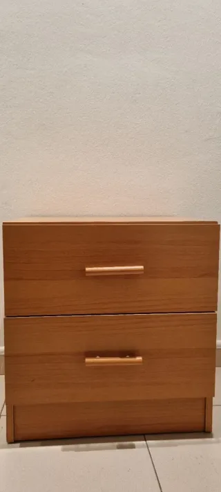 Mesita de noche de madera con acabado en roble. Cuenta con dos cajones. - Tiradores de madera. - Diseño sencillo y funcional. Recogida en Cunit.