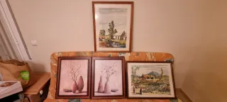 Conjunto de cuatro cuadros decorativos con estilo pintado a mano. Aportan un toque artístico a cualquier estancia. - Marco de madera. - Lienzo de papel. - Sevende por separado. 10€ cada cuadro. - Recogida en Cunit