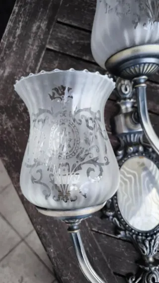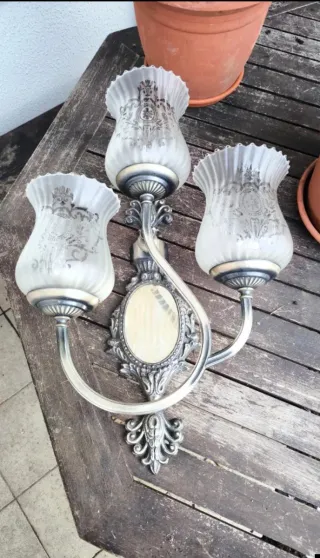 NO ES NEGOCIABLE lámpara de Latón antigua vintage 3 tulipas 1951 de pared con un diseño clásico y detalles ornamentales. Perfecta para añadir un toque de distinción a cualquier estancia. ALTO 50CM ANCHO 35CM FONDO 15CM - Tres tulipas de cristal esmerilado con motivos decorativos. - Estructura de Latón con acabado plateado. - Detalle central ovalado TELEF 655114551