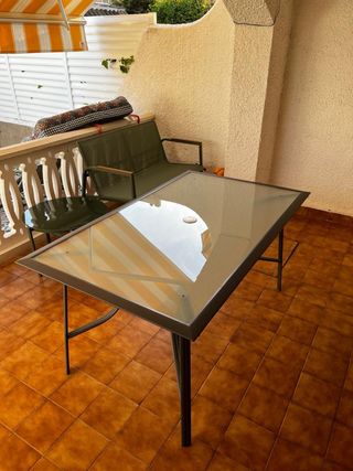 Mesa con superficie de cristal templado y estructura de metal. - Diseño moderno y elegante. - Patas metálicas resistentes. Dimensiones: 0,87 m de ancho 1,47 m de largo 0,71 m de altura Esta en perfecto estado, se vende por que hemos cambiado los muebles.