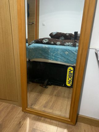 Elegante espejo de pie con un marco de madera de color marrón oscuro. Su forma ovalada lo hace ideal para cualquier habitación. - Marco de madera. - Forma ovalada. Tiene que ajustarse ya que se echa un poco para atrás.