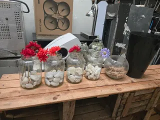 Bonita lámpara de mesa con un diseño único que incluye un jarrón de cristal con flores secas en su interior. La base y el remate superior son de madera. DOS UNIDADES. Precio por las dos. Con bombilla led incluida. - Jarrón de cristal transparente. - Base y detalles de madera. - Pantalla de papel.