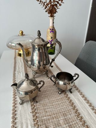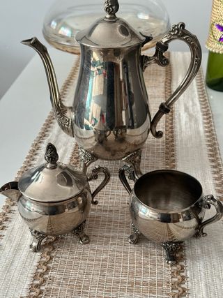Elegante juego de té o café con acabados en plata. - Incluye tetera, azucarero y lechera. - Diseño clásico con patas. - Piezas metálicas con detalles ornamentales.