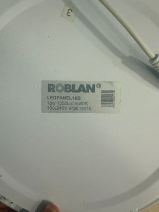 6 dowleds :Panel LED de la marca ROBLAN. - Modelo: LEDPANEL18B - Potencia: 18W - Flujo luminoso: 1350 Lm - Temperatura de color: 6500K - Voltaje: 100-240V - Protección: IP20 - Fecha de fabricación: 10/16