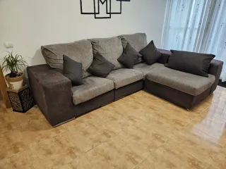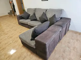 Cómodo sofá chaise longue con un diseño moderno. - Tapicería de tela. - Combinación de colores gris claro y oscuro. - Chaise longue con alcón de almacenamiento. - Incluye 4 taburetes que quedan escondidos. - Asientos desplegable. - Medidas ancho: 275cm. -Medidas chasis longue: 175cm. Negociable, urge venta!