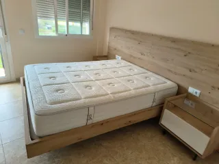 Se vende dormitorio completo con un diseño moderno y elegante. - Cabecero de madera con vetas. - Base de cama de madera. - Mesitas de noche con cristal y cajón. - colchón