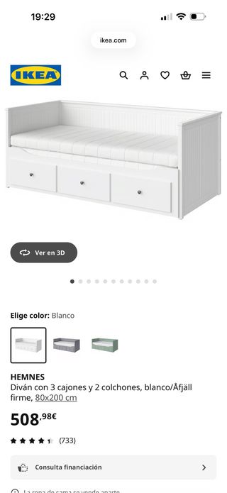 Sofá cama HEMNES de IKEA en color blanco. Incluye 3 cajones y 2 colchones. - Medidas: 80x200 cm. - Acabado firme.