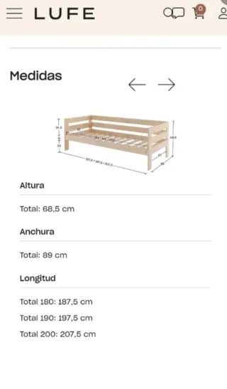 Sofá-cama de madera LUFE, modelo Lore. Un mueble versátil y funcional. - Medidas totales: 68,5 cm (alto) x 89 cm (ancho). - Longitud para cama de 190 cm (197,5 cm totales) - Incluye barra de seguridad