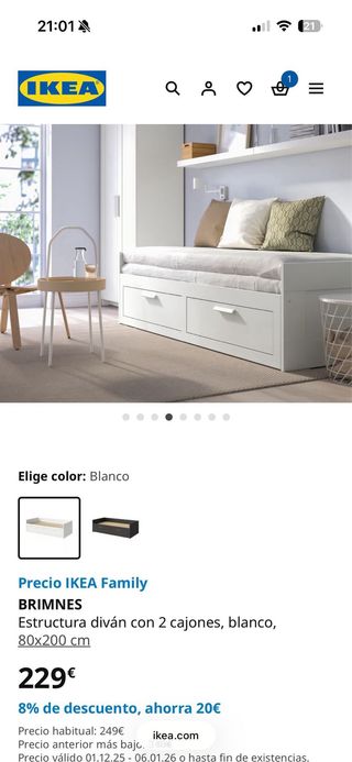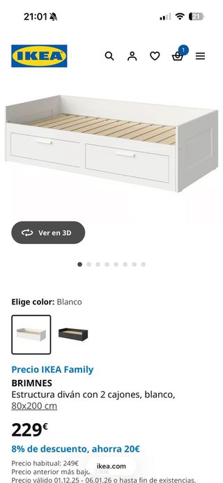 Estructura de diván BRIMNES en color blanco. Cuenta con dos amplios cajones para almacenamiento. - Diseño moderno y funcional. - Cajones integrados para optimizar el espacio. Si quiere puede llevar el colchon pero es de 90