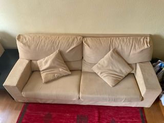 Cómodo sofá diván de tela en color beige. Ideal para tu sala de estar. - Diseño moderno y elegante. - Dos cojines decorativos incluidos. Usado pero esta muy comoda, robusto y todavia puede tener mucha vida. Lo vendemos porque lo cambiamos por otro mas pequeño. 100 euros, mas autorecogida del centro (barrio la latina)