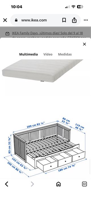 Diván de la serie HEMNES de Ikea en color blanco. Incluye dos colchones. Se puede utilizar como cama o sofá. - Estructura de madera. - 3 cajones amplios - Extensible para ampliar la cama hasta 162 cm - Debido al gran volumen, se debe coordinar para el desmontaje y montaje. No envío. Aunque se facilitará las instrucciones para el montaje, que también estan en Ikea. - En caso de ser necesario montaje en destino, supone un suplemento de 50€ - No se hacen translados.