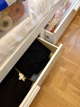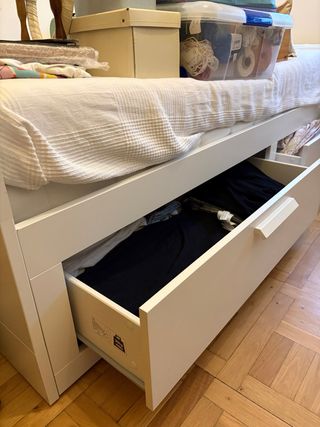 Cama IKEA con 3 cajones grandes de almacenaje. Estructura en blanco y madera pino, usada pero en muy buen estado. - Estructura principal en color blanco. - 3 cajones frontales grandes en acabado de madera de pino. - Incluye colchón cómodo (siempre usado con funda). - Diseño funcional y espacioso. - Perfecta para habitación juvenil, extra o apartamento. Se puede ver y probar sin compromiso. Se puede vender por separado. Preguntar. Imperfectos mayores en las últimas dos fotos, pero se pueden pintar.