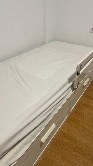 Se vende cama diván de Ikea con dos colchones. - Estructura de madera. - Color blanco. -2 colchones Posibilidad de negociar sin colchones o con solo uno La barrera anticaida no está incluida en el precio pero se podría vender a parte si se está interesado. Actualmente se encuentra montada, la persona que la quiera tendrá que desmontarla. Uno de los colchones tiene la cremallera estropeada